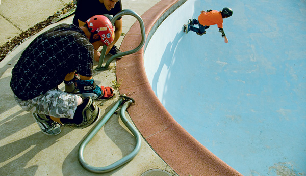 “Continuo fazendo o que sempre fiz, porque sempre tem piscina vazia em algum lugar. Mas hoje temos muitas opções. Se nos anos 90 tinha 20 piscinas por aqui, hoje tem 200. Quando a merda bate no ventilador, as pessoas abandonam as casas e sobram piscinas, simples assim”, ele elabora o óbvio para, em seguida, deixar claro que tempestades econômicas não são exatamente boas-novas para seu lifestyle: “Afeta todo mundo, e a mim também. Já tive meu salário cortado do patrocinador, e talvez perca o patrocínio, simplesmente”, abre o jogo na frente do filho Riley, 11 anos, levando o moleque para a segunda sessão do dia. Ela será em uma casa ocupada por uma família mexicana sem grana para manter o luxo de uma piscina limpa. Salba nem telefona, só aparece com mais cinco marmanjos e toca a campainha. O negócio é simples. Ele e os camaradas secam e limpam a piscina em troca de algumas horas de skate. Claro que a família topa. E parte dela senta no quintal para ver o raro show.