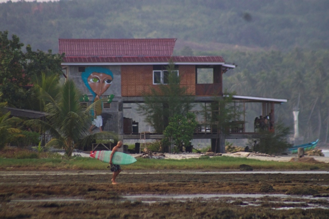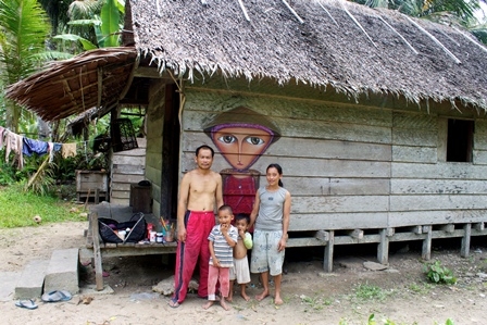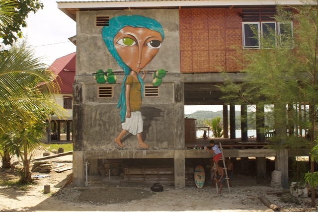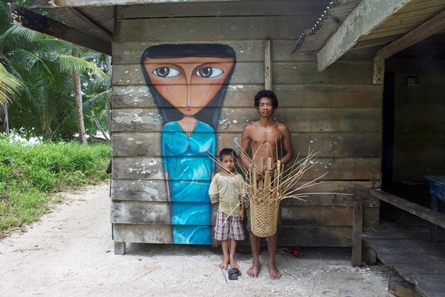 O artista passou alguns perrengues para conseguir se comunicar com os locais, mas diz ter ficado surpreso com a recepção, principalmente das crianças. Na companhia do surfista profissional Igor Moraes, fez os primeiros contatos para pintar um losmen (espécie de bangalô) de uma família em Nias. Recebeu cana, cerveja e comida em troca da pintura dos muros. Em Mentawai, estava a caminho de uma praia para surfar quando passou por uma vila. “As casas eram perfeitas para o trabalho, mas a comunicação foi foda. Sentei com um nativo e pedi para ele me ensinar algumas palavras, anotei em um papel e voltei no dia seguinte. Perguntei para uma mulher: ‘Saya cat dinding?’, que quer dizer ‘posso pintar sua parede?’. Ela me olhou com uma cara de quem não entendeu, abri minha mala com as tintas e ela fez sinal que podia. Comecei a pintar devagar, logo depois chegou o marido dela do meio do coqueiral com um facão gigante. Foi tenso! Pensei: ‘será que eu corro ou continuo?’. Logo percebi que ele também tinha aprovado e fiquei mais tranqüilo. A família era gente boa!”.