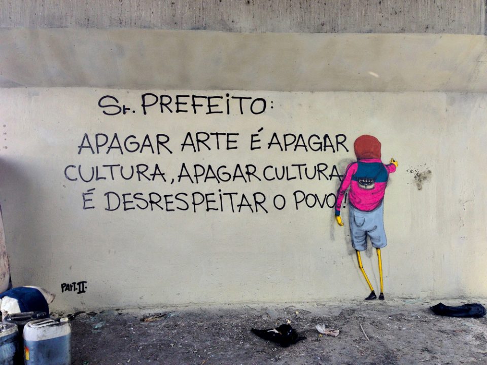 Vocês vivem numa queda de braço com a prefeitura, que costuma apagar grafites de vocês dos muros da cidade. G: Cara, nem temos muito o que falar sobre isso. Chegamos a ir lá falar com eles na gestão do Kassab, mas continuaram apagando nossas coisas. Nosso recado já foi dado. Vamos continuar fazendo. Não vamos deixar de falar o que queremos falar. Isso é certo. Só não entendo como eles podem se preocupar com grafite com tantos outros problemas por aí. Eles vão lá e passam a tinta cinza, paga pela própria população.