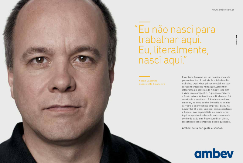 Ambev. Feita por gente e sonhos é a primeira campanha institucional da companhia desde a sua criação em 2000. De lá para cá, a Ambev, reconhecida como uma das melhores empresas para se trabalhar, construiu uma história no Brasil e no mundo alicerçada “em sua gente” (os funcionários), que é constantemente estimulada a realizar grandes sonhos. Para dividir, e assim difundir, esse princípio com toda a sociedade, a campanha traz depoimentos de funcionários e colaboradores sobre os sonhos realizados dentro da Ambev. A campanha foi criada pela Loducca.MPM e até o final do ano, as histórias de 30 funcionários e colaboradores da Ambev serão contadas para todo o Brasil. “A coisa mais importante aqui na Ambev é que as pessoas têm a oportunidade de realizar seus próprios sonhos e com isso contribuir para o sonho de toda a empresa que é ser a melhor empresa de bebidas em um mundo melhor. O mais difícil foi escolher apenas 30 histórias das centenas que tive a oportunidade de conhecer nesses meus 18 anos de Ambev”, afirma Sandro Bassili – Diretor de Relações Socioambientais.
