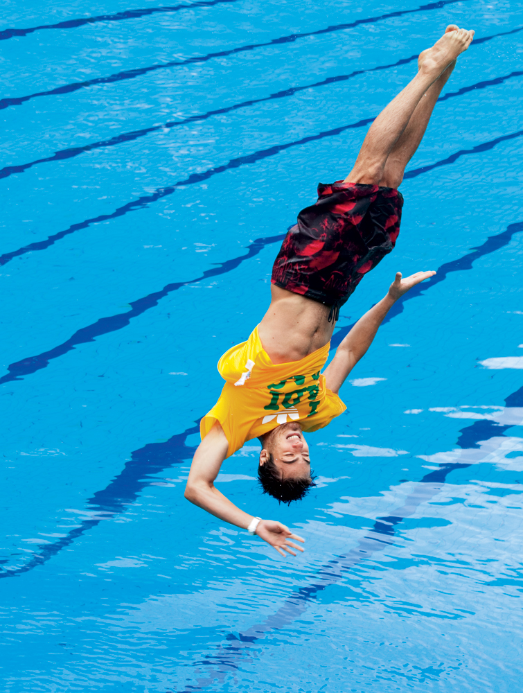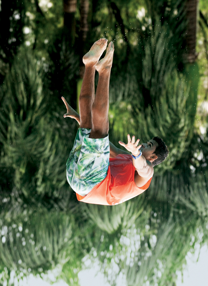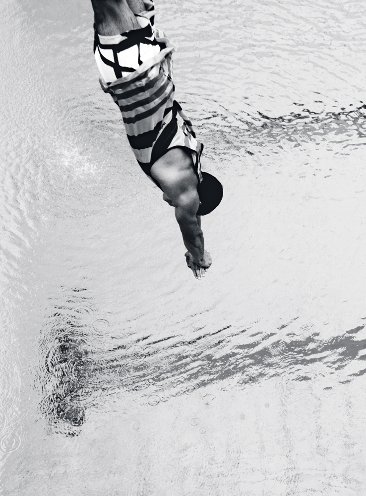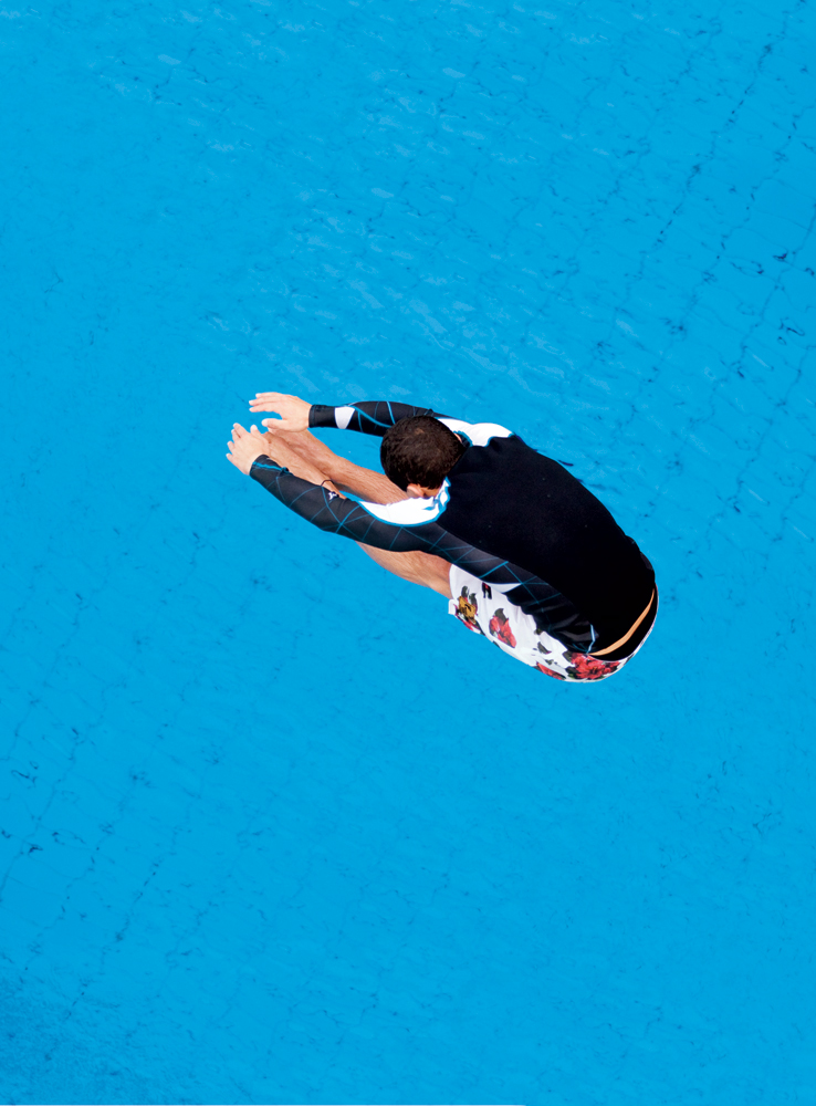 Jackson Andre de Oliveira, Phillipe Delphino de Lima e Gabriel Fuzo Gomes, que fizeram as vezes de modelo neste ensaio, são atletas profissionais de saltos ornamentais do Esporte Clube Pinheiros, em São Paulo. Jackson tem 17 anos e já é campeão brasileiro de 1 e 3 m em plataforma categoria A; o “veterano” Phillipe se dedica aos saltos há 15 anos e aos 24 também já foi campeão brasileiro (oito vezes), além de ter ganhado o bronze no Sul-Americano e participado dos Jogos Pan-Americanos de 2007. Gabriel tem 19 e foi campeão do Circuito Estadual de 2009 e 2010 e terceiro lugar no Troféu Brasil de 2010 e 2011.