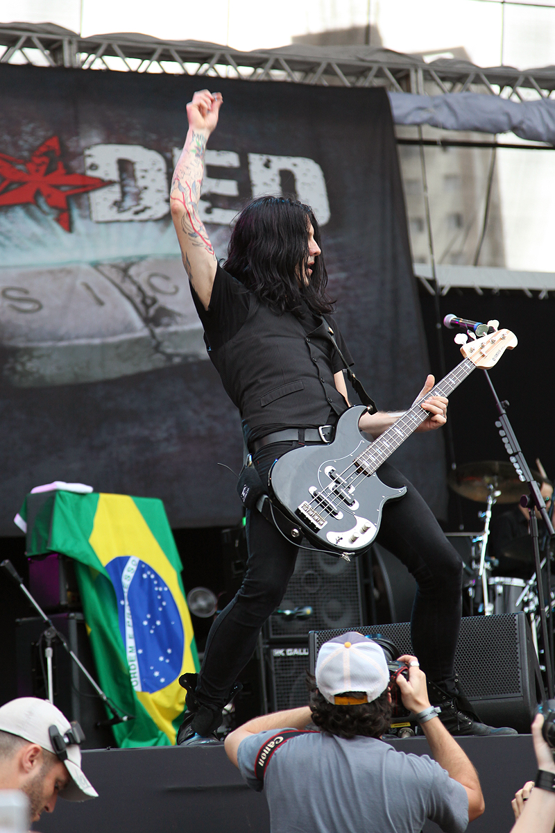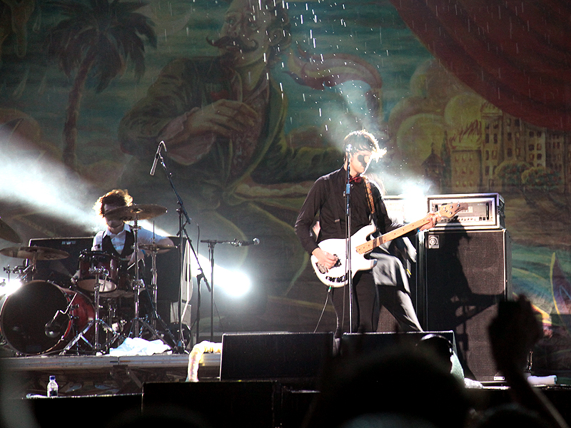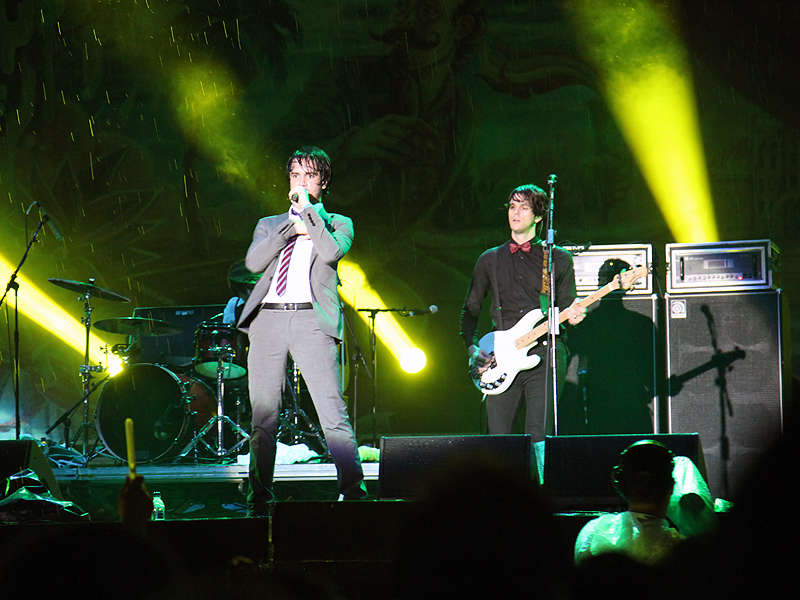 Quando parecia que a chuva esfriaria os ânimos, o Panic! At The Disco assumiu o palco e tratou de fazer os paulistanos dançarem. Animado e parecendo não se importar muito com a água que caía no palco (o show chegou a ser interrompido por alguns minutos para proteger os instrumentos), Brendon Urie falou bastante com o público: elogiou a caipirinha brasileira (“muito melhor do as que fazem nos Estados Unidos”) e disse que aquele era o “melhor show” que eles já haviam feito.