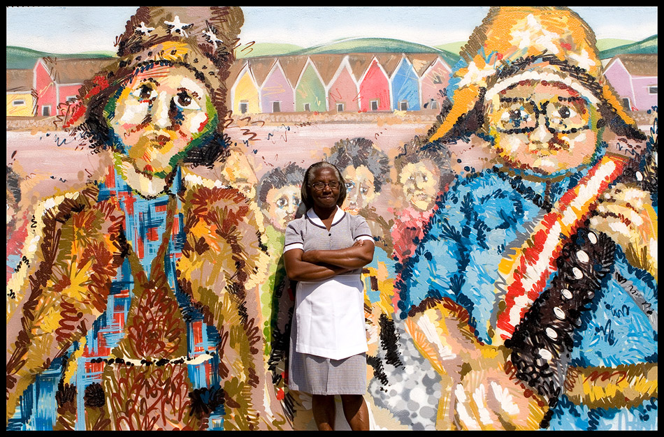 Primeiro eu acho o mural e fica na frente dele esperando alguma pessoa interessante passar. Paro ela e convido a posar para mim. Sempre tento escolher pelas cores [que ela veste] ou pela atitude, pelos traços físicos, alguma coisa que tenha a ver com o mural.