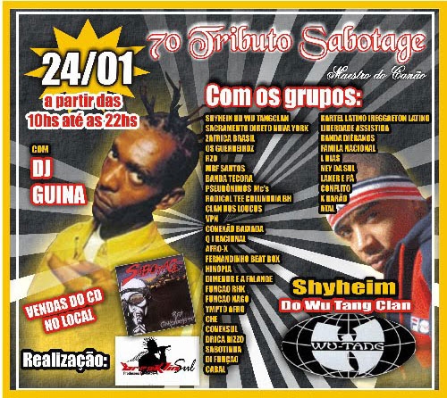 O Tributo Sabotage, que homenageia o rapper morto em 2003, está em sua sétima edição. Chega esse ano com quarenta atrações, nomes como RZO, Z’Africa Brasil, Fernandinho Beat Box e Shyheim do Wu Tang Clan sobem ao palco para prestigiar Sabotage, um dos grandes MCs do rap nacional.